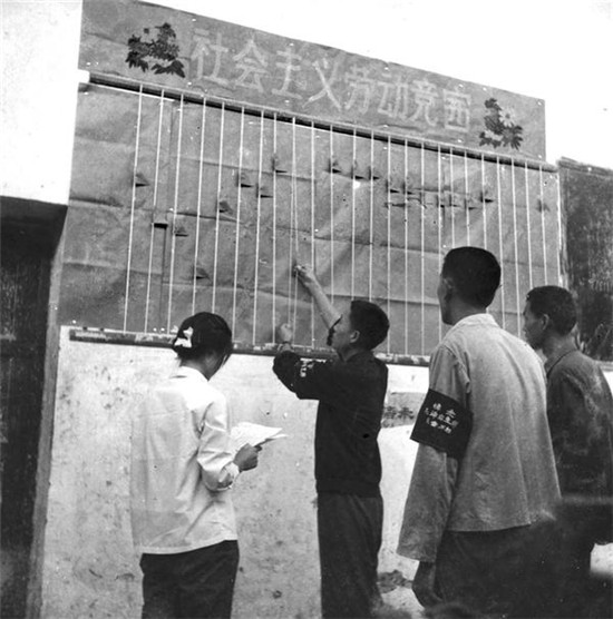 項城工人佩戴黑紗開展社會主義競賽。