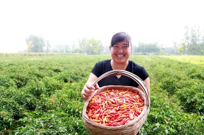 在朱樓行政村,朱高杰、王麗夫妻倆正帶領(lǐng)20多名采摘工人在辣椒田里采摘艷紅、泡椒兩個(gè)品種,地頭停放著盛滿辣椒的三輪車和五六個(gè)蛇皮袋,火紅的辣椒映襯著小兩口臉上燦爛的笑容:“大豐收呀,這塊地是泡椒,還沒有出地頭,就劃3.8元一斤了,走向市場至少五六元錢。咱吃的泡椒鳳爪、泡椒罐頭,都是這做的。像那塊地的艷紅,就像它的名字一樣又紅又鮮艷,出地頭就得七八塊,賣到市場上都10多元一斤,主要賣到四川、湖北等地,這是火鍋底料、炒菜的必備品,這是個(gè)炒出來有香味的辣椒品種?!蓖觖惸苷f會(huì)道,而且在她的帶動(dòng)下,全鄉(xiāng)許多親朋好友都在種植辣椒。像王麗一樣,汲水鄉(xiāng)種植辣椒面積突破了1萬畝,整個(gè)鄲城縣種植辣椒突破5萬畝。