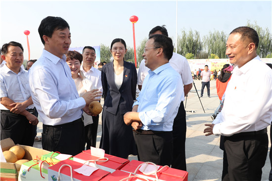 一問一答間,爽朗的笑聲響徹節(jié)日上空,農(nóng)民們喜笑顏開,傳遞出濃濃的幸福。大棗、黑木耳、小麥粉、粉條等西華縣各具特色的農(nóng)產(chǎn)品紛紛亮相,除了展示各自的“增收實(shí)力”,也展示出幾年來發(fā)展農(nóng)業(yè)特色經(jīng)濟(jì)的豐碩成果?!罢钆_(tái),農(nóng)民唱戲,每年一度的農(nóng)民豐收節(jié)既是農(nóng)民歡樂的節(jié)日,也是展銷農(nóng)產(chǎn)品的紐帶平臺(tái),今天我們奉母鎮(zhèn)展示了本地原生態(tài)粉條和純糧美酒,希望借助豐收節(jié)機(jī)遇,拓寬銷路實(shí)現(xiàn)農(nóng)民增收?!蔽魅A縣奉母鎮(zhèn)黨委書記陳鵬告訴記者。