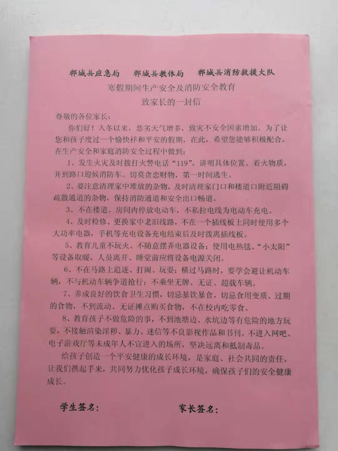 《寒假期間生產(chǎn)安全和消防安全教育致家長的一封信》包括正確報119火警、電動車充電、電熱毯使用、保持疏散通道暢通等消防安全知識以及交通安全、食品安全、網(wǎng)絡安全等,內容豐富,有很強的針對性。鄲城縣委常委、常務副縣長王智華高度重視《一封信》的印制發(fā)放工作,專門召開會議要求縣應急局、縣教體局、縣消防救援大隊各司其職、密切配合,縣消防救援大隊牽頭,挑選貼近生活、身邊常見的安全及消防常識,以簡潔實用、通俗易懂的語言,印制《一封信》內容;縣教體局要迅速部署,確保在放假之前,把《一封信》發(fā)放到每名學生手中。為確保取得實效,縣教體局、縣消防救援大隊還聯(lián)合發(fā)文,要求《一封信》必須由家長和學生共同完成學習,學習完畢后家長和學生還要共同簽名確認,假期結束后由學校統(tǒng)一收回報教體局存檔。