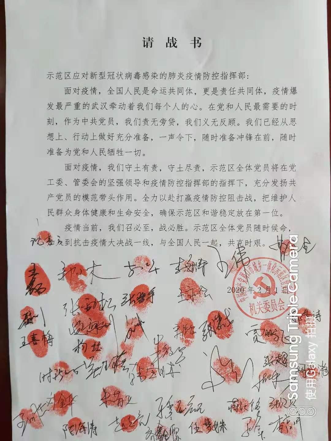 為了能到戰(zhàn)“疫”一線,示范區(qū)廣大黨員干部紛紛簽下“請戰(zhàn)書”,自愿要求加入到抗擊新型冠狀病毒感染的肺炎疫情戰(zhàn)斗中去?!罢垜?zhàn)書”上,他們紛紛按下鮮紅的指印,在指印下面,是每個黨員堅(jiān)定的簽名,從這些指印和簽名可以看出每個黨員堅(jiān)定的黨性和為了抗擊疫情大無畏的英雄氣概。
