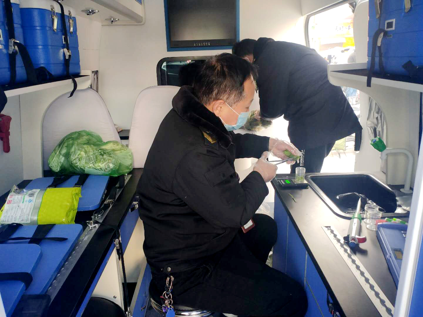 記者看到,食品安全快速檢測車與傳統(tǒng)的快檢室相比,更加機動、快速、便捷,可以現(xiàn)場開展快速檢測。車上配備有農(nóng)藥殘留快速檢測箱、溫濕度計、電加熱板、超聲波清洗器等車載儀器設(shè)備,執(zhí)法人員在實施剪碎、浸泡、試劑反應(yīng)、數(shù)據(jù)讀取等一系列檢測步驟后,最快30分鐘就能對生鮮肉、果蔬、米面油等食品中有毒、有害殘留物質(zhì)等100多項內(nèi)容進(jìn)行快速檢測。
