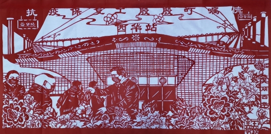 “我在為縣委林書記高鐵站送工創(chuàng)作一幅剪紙作品,你看看效果怎么樣?!苯眨魅A縣奉母鎮(zhèn)剪紙藝人王銀生拿著剛剛創(chuàng)作的剪紙作品讓“疫情防控小分隊”提意見。