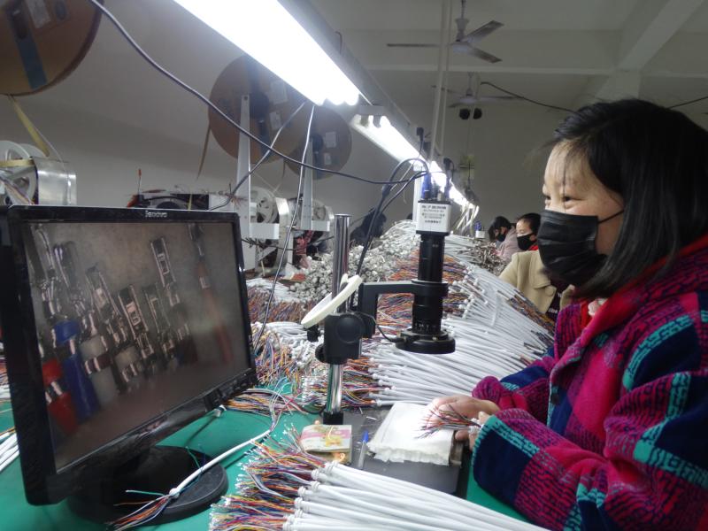 近日,沈丘縣周營鎮(zhèn)眾邦電子來料組裝扶貧車間內(nèi),當(dāng)?shù)卮迕裼秒娔X檢驗(yàn)細(xì)微端子產(chǎn)品質(zhì)量。