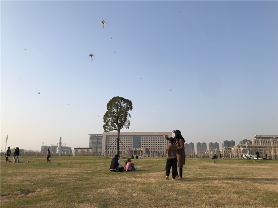 3月20日,周口天氣晴朗,最高氣溫27℃,東風(fēng)3-4級(jí)。在市公安局南草坪廣場(chǎng),市民帶著口罩,在空曠的場(chǎng)地放風(fēng)箏、曬太陽(yáng),享受春光。