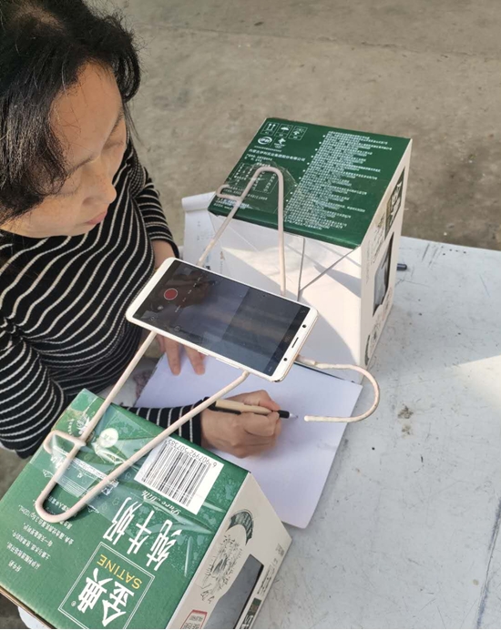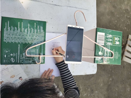 在備課時(shí),朱霞很快遇到了難題:手機(jī)沒(méi)法固定,街上手機(jī)店又全部停業(yè),網(wǎng)上買(mǎi)的手機(jī)固定夾發(fā)不了貨。為了不耽誤學(xué)生上課,她想到用晾衣?lián)巍⑴D滔渥龀珊?jiǎn)易支架,組裝后居然效果不錯(cuò)。就這樣,一個(gè)晾衣?lián)?、兩個(gè)牛奶箱和一部手機(jī)組成了她的“三尺講臺(tái)”。