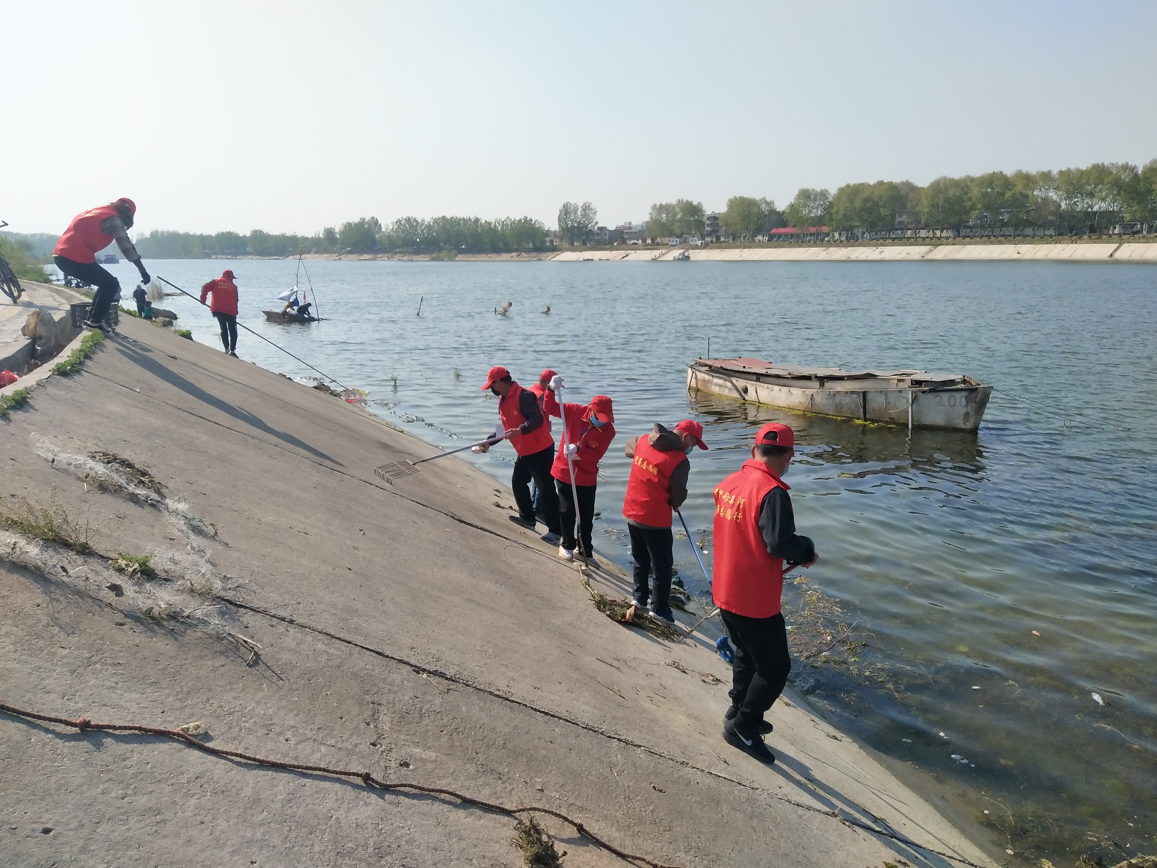 問卷棚旁是擺放整齊的河面垃圾清理工具,鐵锨、鐵耙、繩索、編織袋、掃帚、垃圾箱一字排開,寫有“川匯區(qū)巡河護河”、“志愿者服務(wù)總隊”字樣的紅旗迎風(fēng)飛揚。記者向志愿者借了身衣服,和大家一起等著護河總指揮孫彩云分工。