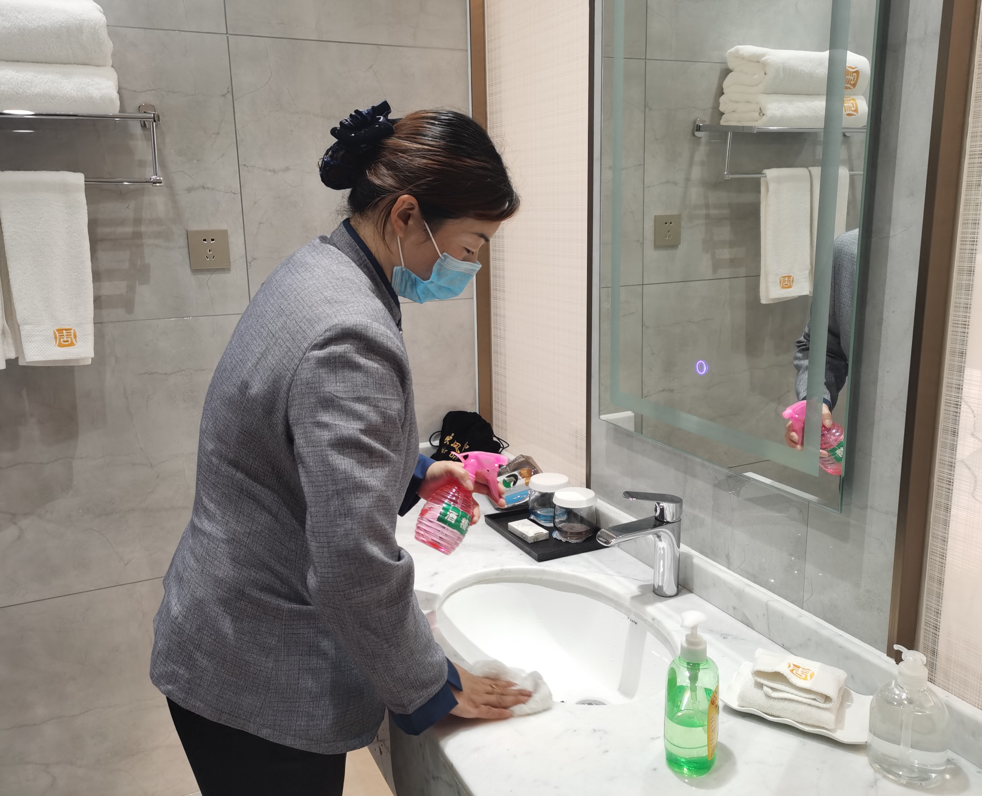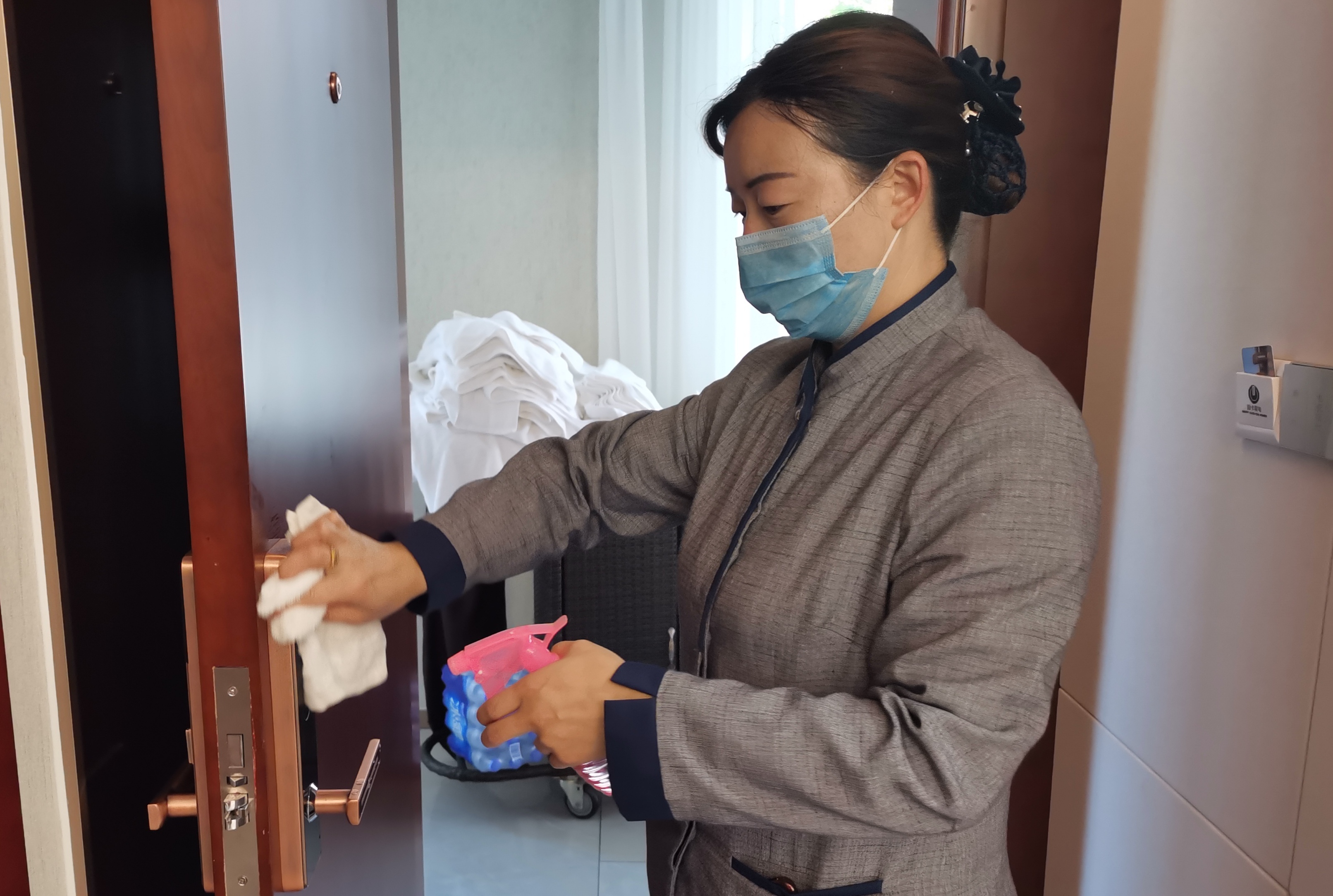 5月10日,記者在“兩會”駐地酒店看到,酒店工作人員不時對客房和公共場所、會議室進行消毒、擦拭。受疫情影響,“兩會”駐地酒店工作人員認真和精心準(zhǔn)備,加強了對代表、委員駐地消殺防疫,還貼心地放置了一次性電梯按鍵專用紙、酒精等物品。
