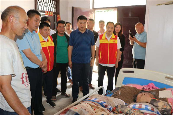 又到了“三夏”麥?zhǔn)占?,趙志發(fā)在搶收搶種的同時(shí),還要照顧患病的妻子,他一人能否忙顧過來?4日上午,太康縣網(wǎng)信辦主任張照營(yíng)、縣好人協(xié)會(huì)會(huì)長(zhǎng)王勇、秘書長(zhǎng)朱業(yè)德、中國(guó)好人、河南省四通鍋爐有限公司董事長(zhǎng)馮坤等一行9人,帶著米面油等慰問品來到趙志發(fā)的家里。漂亮的磚瓦房,整潔的庭院,院子中石榴樹、核桃樹與一側(cè)種植的豆角、西紅柿等蔬菜高低輝映。處處顯示著主人的勤勞與干凈?!懊看蝸矶冀o俺帶禮品?,F(xiàn)在家里啥都不缺了?!睆闹驹刚呤掷锝舆^慰問品,趙志發(fā)笑呵呵地對(duì)張照營(yíng)等人說。