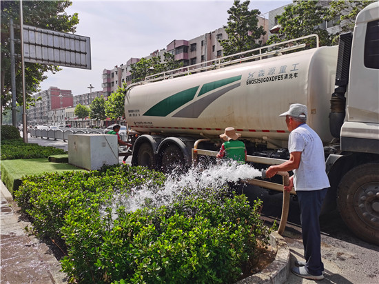 6月4日,園林工人在市區(qū)七一路為綠化帶內(nèi)植被澆水“解渴”。近期我市持續(xù)高溫天氣,為應(yīng)對連續(xù)高溫,綠化部門加大對綠化樹木的澆灌灑水頻次,為城區(qū)的花草樹木“消暑”, 確保綠化植物的存活率。