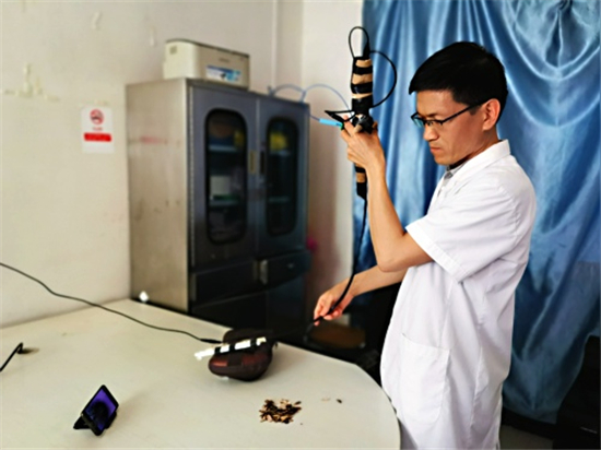 “這是氣管鏡,這是顯示屏,這是氣管,這是模擬人的胸部?!?月5日上午,在市婦幼保健院南院區(qū)兒科診室內(nèi),該科醫(yī)生徐公彥拿著自制的模擬呼吸內(nèi)鏡向記者演示。