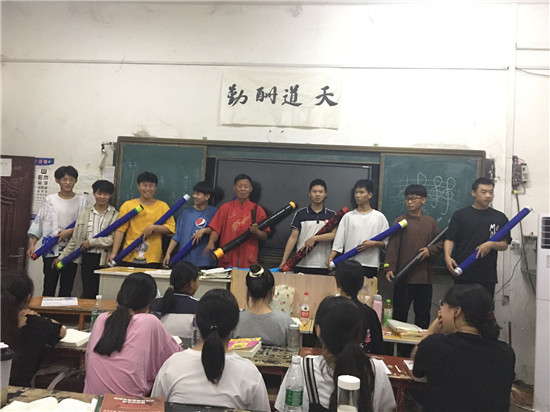 7月1日晚上,太康縣第二高級中學(xué)的一班學(xué)生們的音樂課,請來他傳授漁鼓道情,他領(lǐng)著學(xué)生們,排成一行,右手拍打道情筒,左手轉(zhuǎn)動,打起響板,這種獨(dú)特的藝術(shù)惹得學(xué)生娃們愛不釋手。在建黨日里,王在禮為學(xué)生娃們上了一堂精彩非遺藝術(shù)課。
