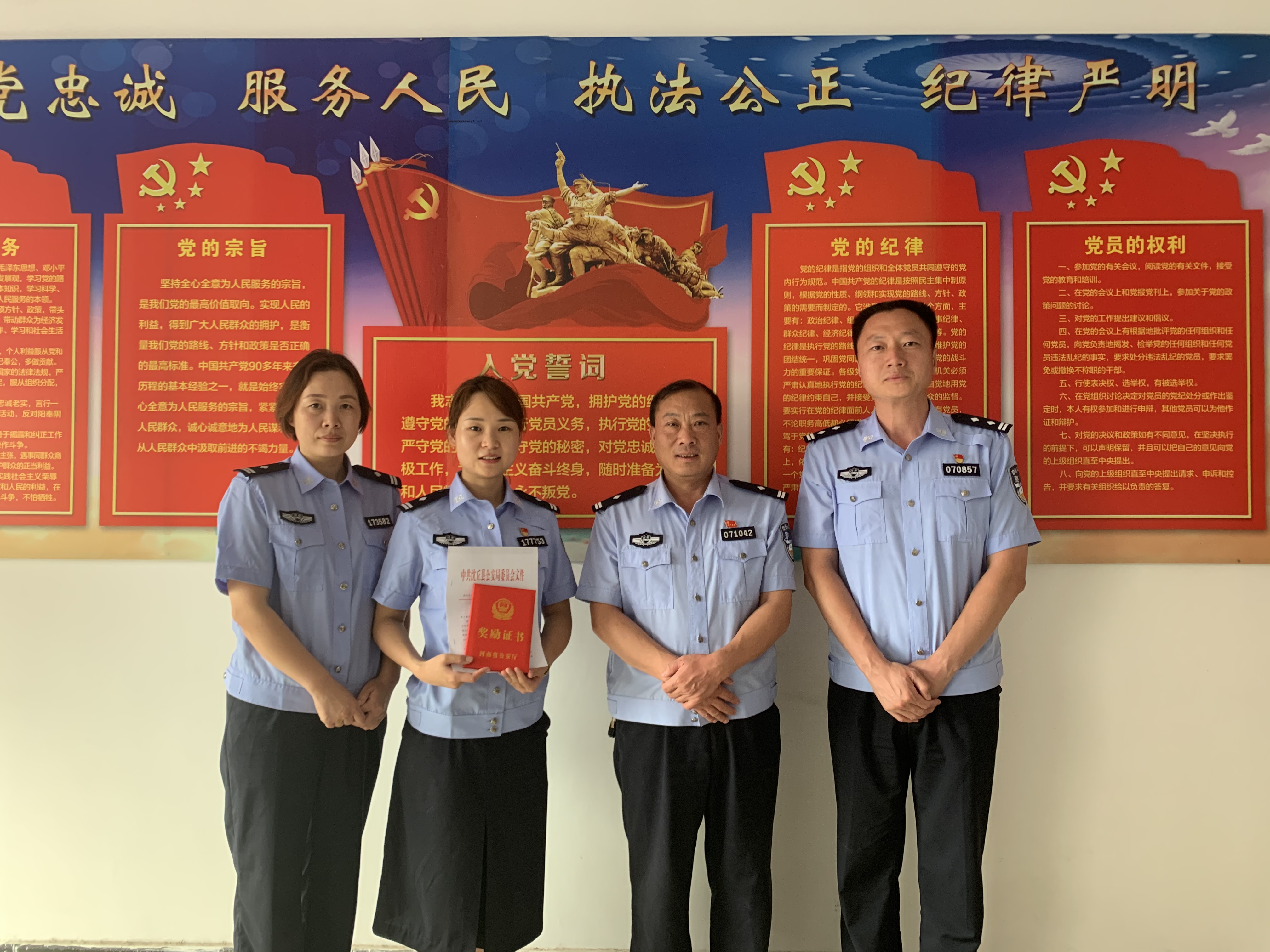 7月5日上午,沈丘縣公安局黨委委員、政辦室主任黃長(zhǎng)春、組教科科長(zhǎng)李文艷到西關(guān)派出所,為在“迅雷”行動(dòng)中表現(xiàn)優(yōu)異,抓獲7名違法犯罪嫌疑人的女民警梁梁同志送個(gè)人嘉獎(jiǎng)。