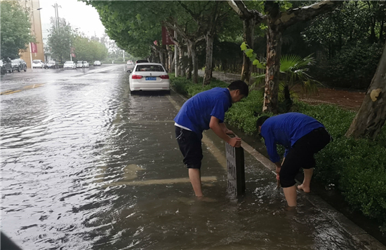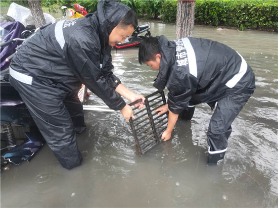 從7月21日傍晚起,商水縣普降暴雨,縣城區(qū)內(nèi)多處道路被淹,為保障群眾出行安全,縣城管局迅速啟動防汛排澇緊急預(yù)案,多措并舉,全力開展防汛排澇工作。圖為7月22日,商水縣城管局應(yīng)急人員在商慶路北段徒手對道路雨水管網(wǎng)排水口進(jìn)行疏通。