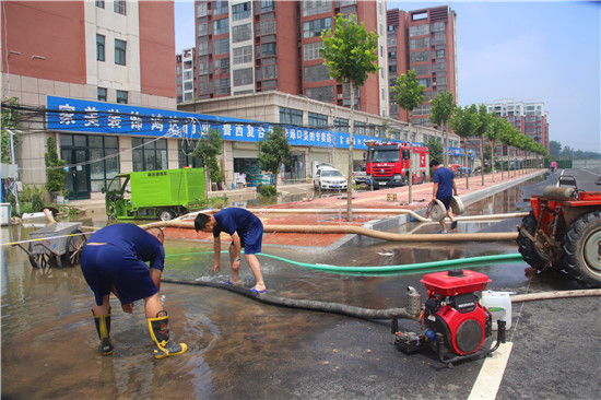 為加快排水速度,港區(qū)在匯林大道增設(shè)一個臨時提泵站,以每小時1200立方米的速度,開足馬力,全天排水。同時,安排工作人員24小時值班,緊盯排水動態(tài),及時清除泵站格柵垃圾,將雨水順利排至沙潁河,減少道路雨水負載量。針對社區(qū)和道路積水情況,各職能部門調(diào)集全部可調(diào)動的潛水泵,迅速排出社區(qū)和道路積水。