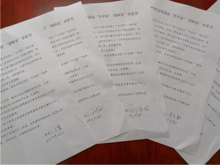 傳導(dǎo)壓力,壓實責任。壓實全面從嚴治黨主體責任,認真統(tǒng)計匯總有子女參加中考、高考的干部職工情況,逐一簽訂《嚴禁操辦“升學(xué)宴”“謝師宴”承諾書》,逐級開展預(yù)防提醒談話,精準傳導(dǎo)壓力和責任,教育引導(dǎo)干部職工自覺抵制操辦、參與“升學(xué)宴”、“謝師宴”。