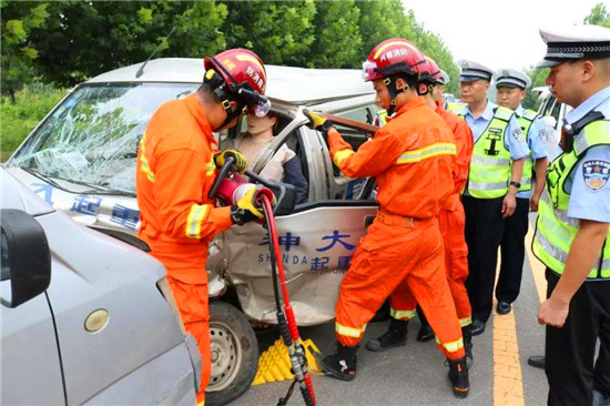 模擬演練事件現(xiàn)場(chǎng)預(yù)設(shè)在326省道太康縣與柘城交界處,有兩輛輕型貨車正面相撞,一輛貨車駕駛員被困在嚴(yán)重變形的駕駛室內(nèi)身受重傷,車輛嚴(yán)重受損并且隨時(shí)有起火爆炸危險(xiǎn)。