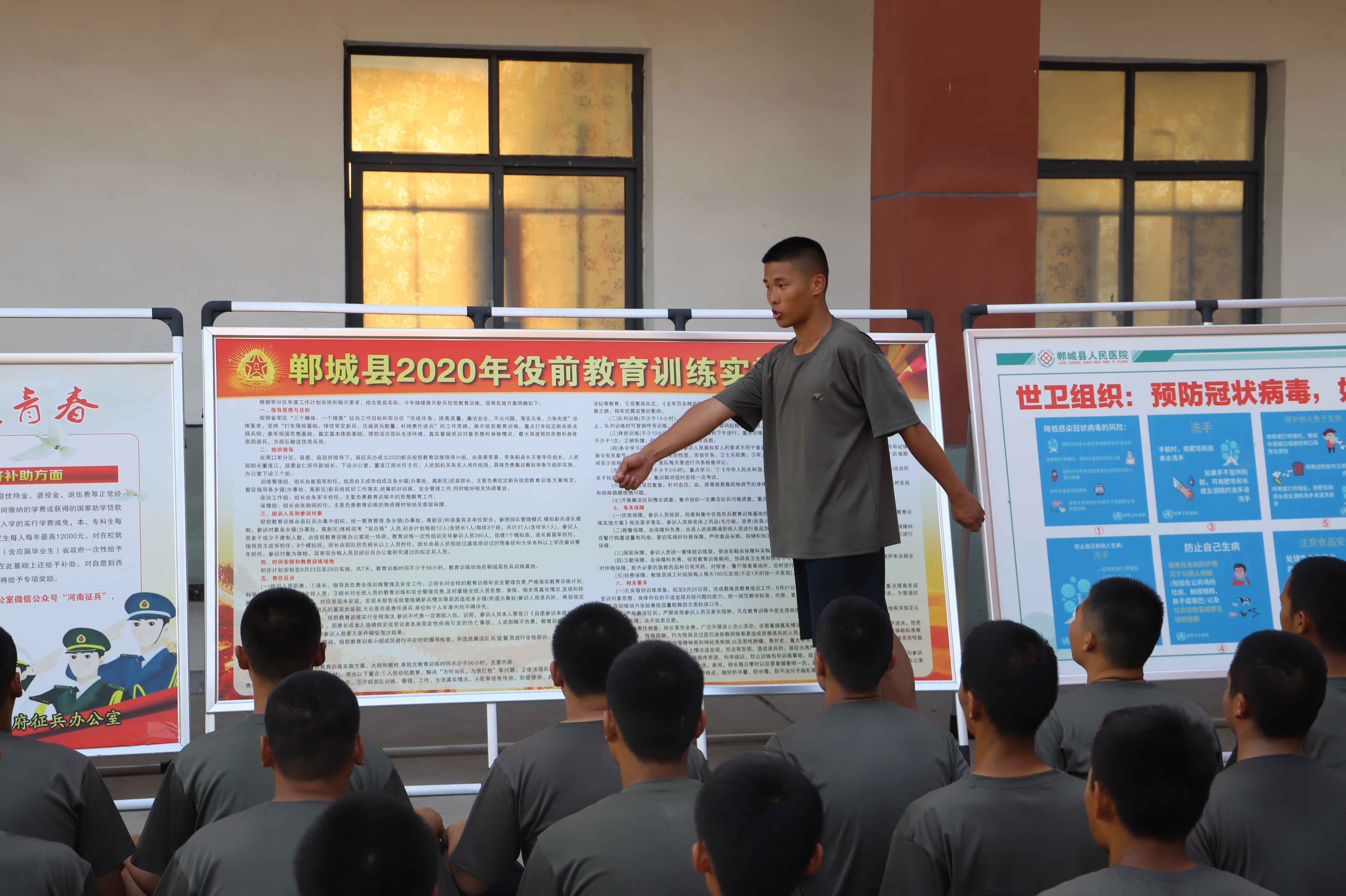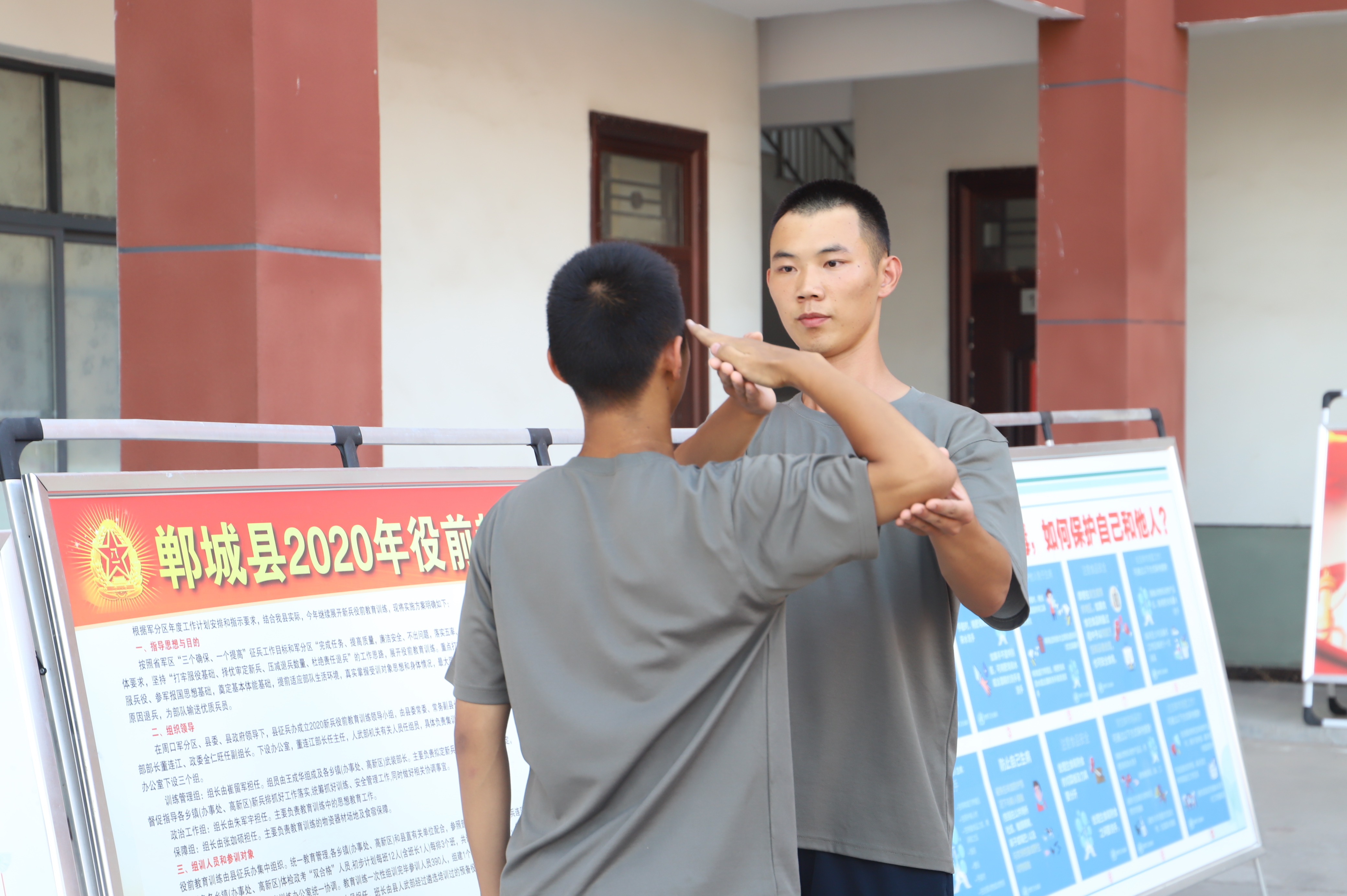 蛙跳、鴨子步、俯臥撐、側(cè)身敬禮、蹲起……盡管汗流浹背,兩位“老兵”在新兵面前沒有一絲疲倦,充分展現(xiàn)了軍人的風(fēng)采,也流露出了兩位青年向往軍營的堅定意志。