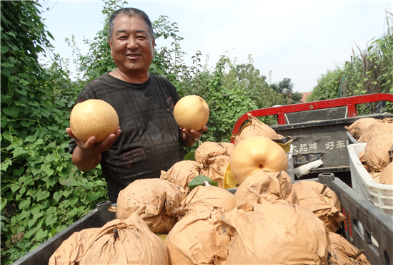 走進(jìn)一排排枝繁葉茂的梨園基地,葉子在陽光的映襯下泛著綠油油的光亮,套著袋的黃金梨掛滿了枝頭。“恁瞧瞧這金黃色的梨果,長的多喜人,最大的梨果估摸著有三斤多重,最小的也有斤把重,皮薄肉厚汁多,既香甜可口,又無核無渣,很是俏銷?!辈烧陂g,果農(nóng)們歡聲笑語,興致勃勃地說。