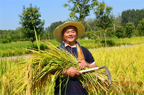 光山縣文殊鄉(xiāng)東岳村,四方景家庭農(nóng)場(chǎng)黨支部書記楊長(zhǎng)太家的稻子喜獲豐收,并給我們?cè)V說著村里這一年的新變化。劉宏冰 攝