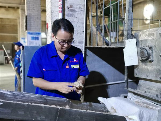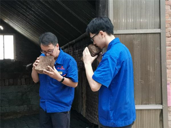 9月17日上午,大河網記者在河南仰韶酒業(yè)有限公司的制曲車間看到,曲磚生產線正在緊張生產,張振科抓起傳送帶上的原料進行擠壓,查看原料的水分度和粉碎度。和生產線的工人交流后,張振科又和徒弟來到曲庫,分別拿起半塊曲磚,放到鼻子下,深深吸氣,嗅聞曲磚的曲香。