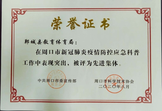 近日,市委宣傳部、市科協(xié)聯(lián)合表彰周口市新冠肺炎疫情防控應(yīng)急科普工作先進(jìn)集體和先進(jìn)個人,鄲城縣教體局被表彰為先進(jìn)單位,縣教體局副局長劉廣鋒被表彰為先進(jìn)個人,為全縣教育系統(tǒng)疫情防控工作再添光彩。