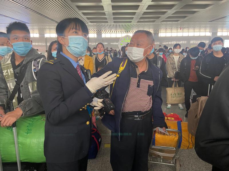 今年30多歲的王琪就是其中一名客運值班員。她家在濮陽市,今年6月份從高鐵許昌北站調(diào)到高鐵周口東站工作,她的主要工作是在旅客進入候車廳后,引導(dǎo)旅客有序排隊進入站臺,調(diào)配崗位人員,遇到旅客救助等突發(fā)狀況,及時處置。