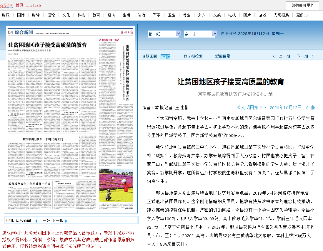今天(2020年10月12日)出版的《光明日?qǐng)?bào)》綜合新聞版,以頭條顯著位置刊登《讓貧困地區(qū)孩子接受高質(zhì)量的教育——河南鄲城把教育扶貧作為治根治本之策》,對(duì)鄲城教育成果進(jìn)行了詳細(xì)而深入的報(bào)道,這里全文轉(zhuǎn)載,以饗讀者——