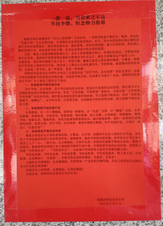 “節(jié)約糧食必須從我們自己做起,從身邊的人做起,更要從小事做起”。該公司職工紛紛表示,勤儉不是吃苦,“光盤”是節(jié)約,是習(xí)慣,是一種品質(zhì),更是對黨中央號召反對浪費(fèi)的響應(yīng),對國網(wǎng)“三節(jié)約”精神的認(rèn)真詮釋和體現(xiàn)!