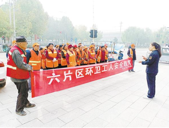 為保障環(huán)衛(wèi)工人的安全,項(xiàng)城市城管局每周二定期對環(huán)衛(wèi)工人開展安全教育,提醒環(huán)衛(wèi)工人霧天不上主干道、掃地順車道、過馬路注意信號燈等,增強(qiáng)了環(huán)衛(wèi)工人的安全交通意識。圖為項(xiàng)城市城管局六片區(qū)負(fù)責(zé)人為環(huán)衛(wèi)工人講解安全知識。