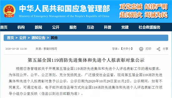 此次評選表彰工作堅持公開、公平、公正的原則,按照自下而上、逐級推薦、民主擇優(yōu)的方式進行,11月2日公示結束。據(jù)悉,這是首次將新組建的國家綜合性消防救援隊伍及其指戰(zhàn)員納入該獎項評選表彰范圍。