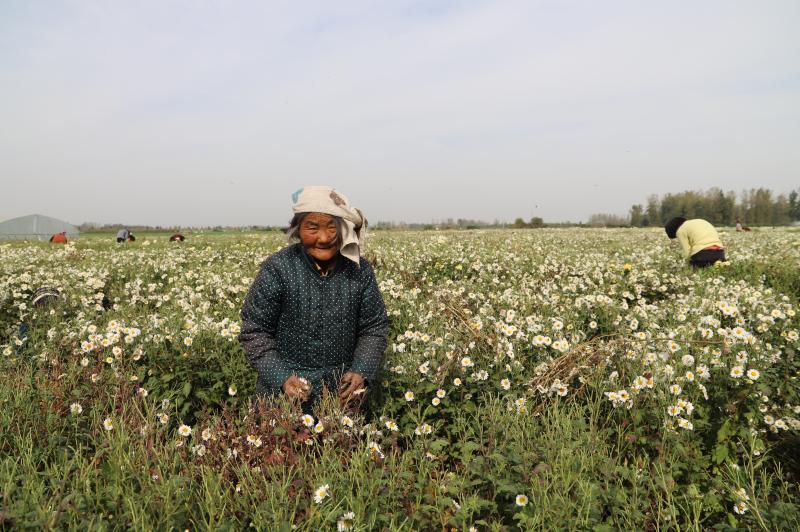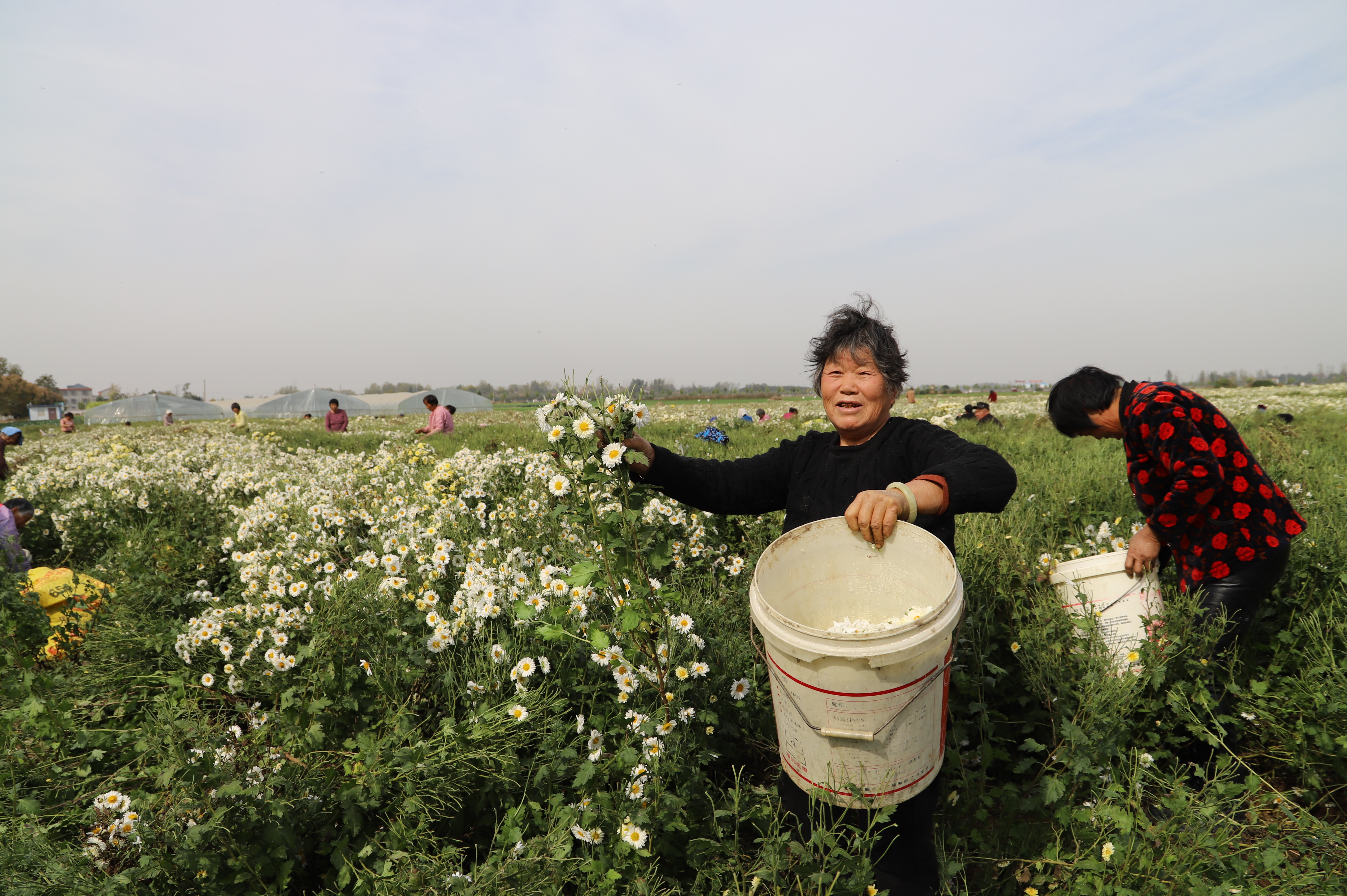 原來,菊花田的老板叫晉振中,于2018年從全縣脫貧攻堅(jiān)種植信息渠道得知種菊花能致富,銷售的末端是安徽亳州的藥材市場和一些花茶商家。特別是種植方式和平原種植紅薯一樣,把田地打成壟,栽苗、施肥、澆水、除草,9月份采摘一次、11月份采摘一次,剩下的菊花秸稈粉碎到田間作為肥料,還能種植晚小麥,十分方便。于是,他通過鎮(zhèn)村兩級黨員干部協(xié)助流轉(zhuǎn)了100畝土地,2019年就掙了20多萬元。由于晉菜園村是貧困村,在他的菊花田務(wù)工的勞動(dòng)力大多是貧困戶,能帶動(dòng)近百戶貧困戶脫貧致富,晉振中欣慰地覺得自己為脫貧攻堅(jiān)做了一份大貢獻(xiàn)。