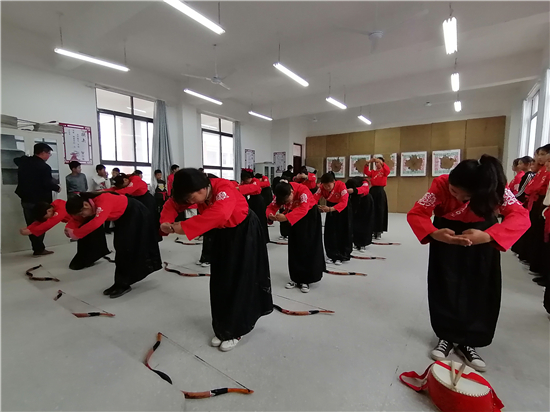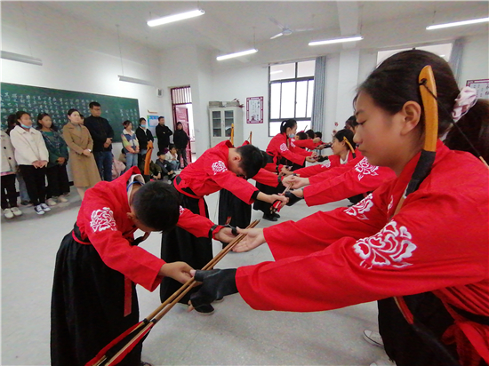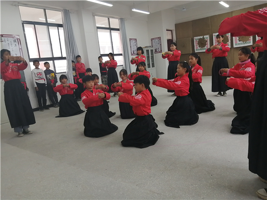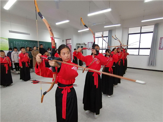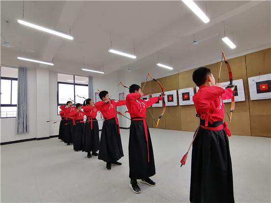 在皮營學(xué)?;顒?dòng)室,學(xué)校舞蹈社團(tuán)的小朋友展示了傳統(tǒng)儀式《鹿鳴》,深情的演繹,展示了他們對國學(xué)經(jīng)典的理解。禮射是禮樂文明重要組成部分,習(xí)射先習(xí)禮,射以觀德。習(xí)射可以強(qiáng)健體魄,其中還蘊(yùn)含了眾多古人先賢的智慧。皮營學(xué)校禮射興趣班的小朋友進(jìn)行禮射表演,隨著挾矢,正筈,審固,舉弓,引彀,發(fā)矢,斂弓,執(zhí)弦等一系列指令,拈弓搭弦展示禮射八法。在這里,學(xué)生們通過不同方式的展示,詮釋自己對“禮”“樂”的理解和認(rèn)知。