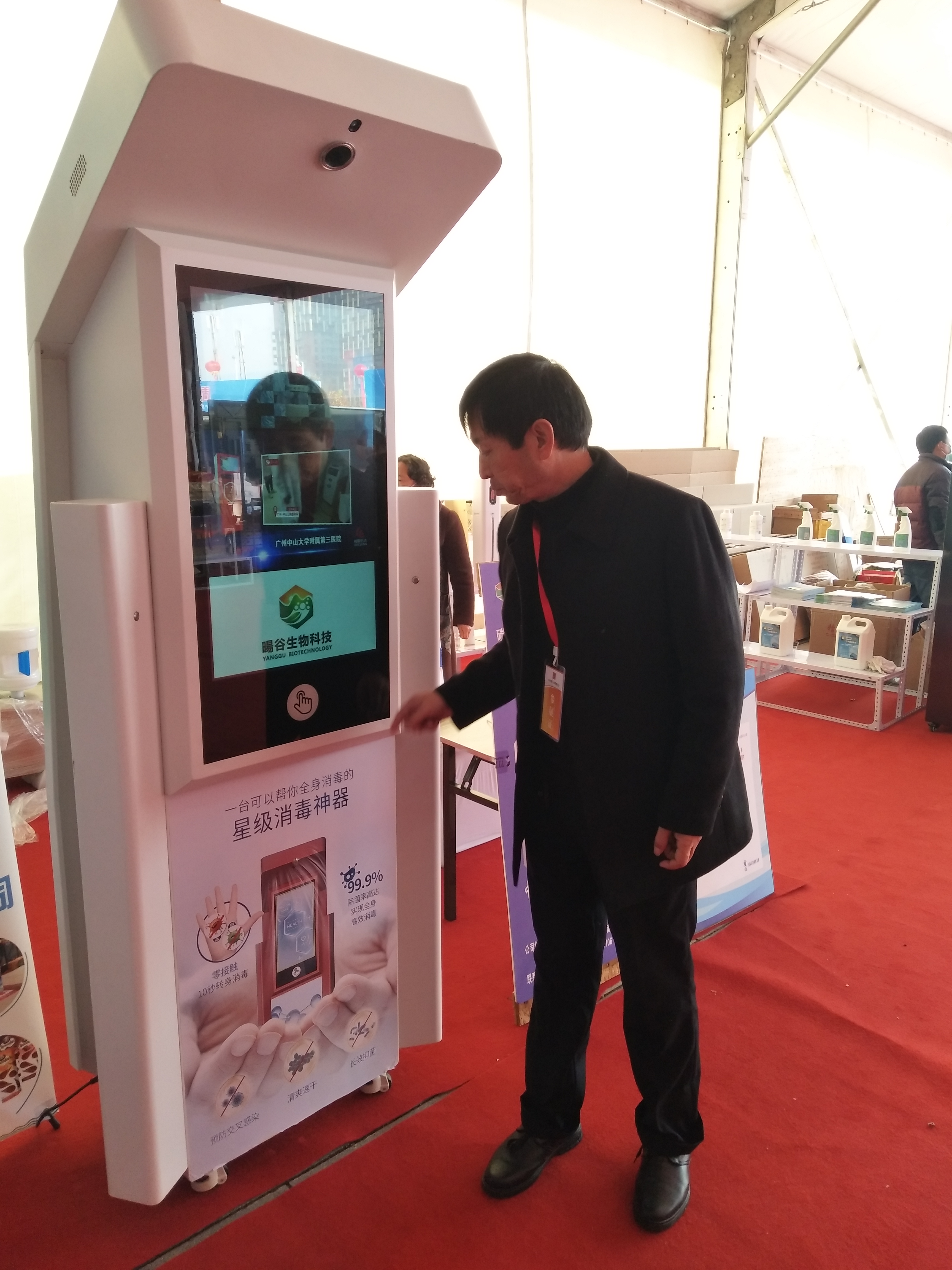 手掌往感控區(qū)上輕輕一罩,液晶屏四角就噴出霧化消毒液,大概持續(xù)10秒,足夠人轉(zhuǎn)一圈做周身消毒——在周商產(chǎn)品展示展覽大廳的西南角,北京陽谷生物科技有限公司市場部總監(jiān) 、項(xiàng)城人張清峰在介紹“人體感應(yīng)消毒機(jī)”,引得市民紛紛圍觀體驗(yàn)。由于消毒液沒有異味,部分市民質(zhì)疑是清水,對此張清峰說:“我們用的是‘竹芳牌’碳酸型微酸性次氯酸消毒液,我們的消毒機(jī)主要是面向校園推廣的,給孩子用的東西除了要有效,還得保證安全溫和,碳酸型的消毒液就沒有這么大的刺激性。”據(jù)張清峰介紹,“人體感應(yīng)消毒機(jī)”是今年五月下旬生產(chǎn)的新品,目前處在推廣階段,“當(dāng)?shù)弥芸谝k第一屆周商大會的消息,我第一時間想到要把消毒機(jī)展示給家鄉(xiāng)父老。我是個在北京打拼十多年的項(xiàng)城人,目前河南分公司由我負(fù)責(zé),項(xiàng)城市政府給了我很多支持?!?/p>