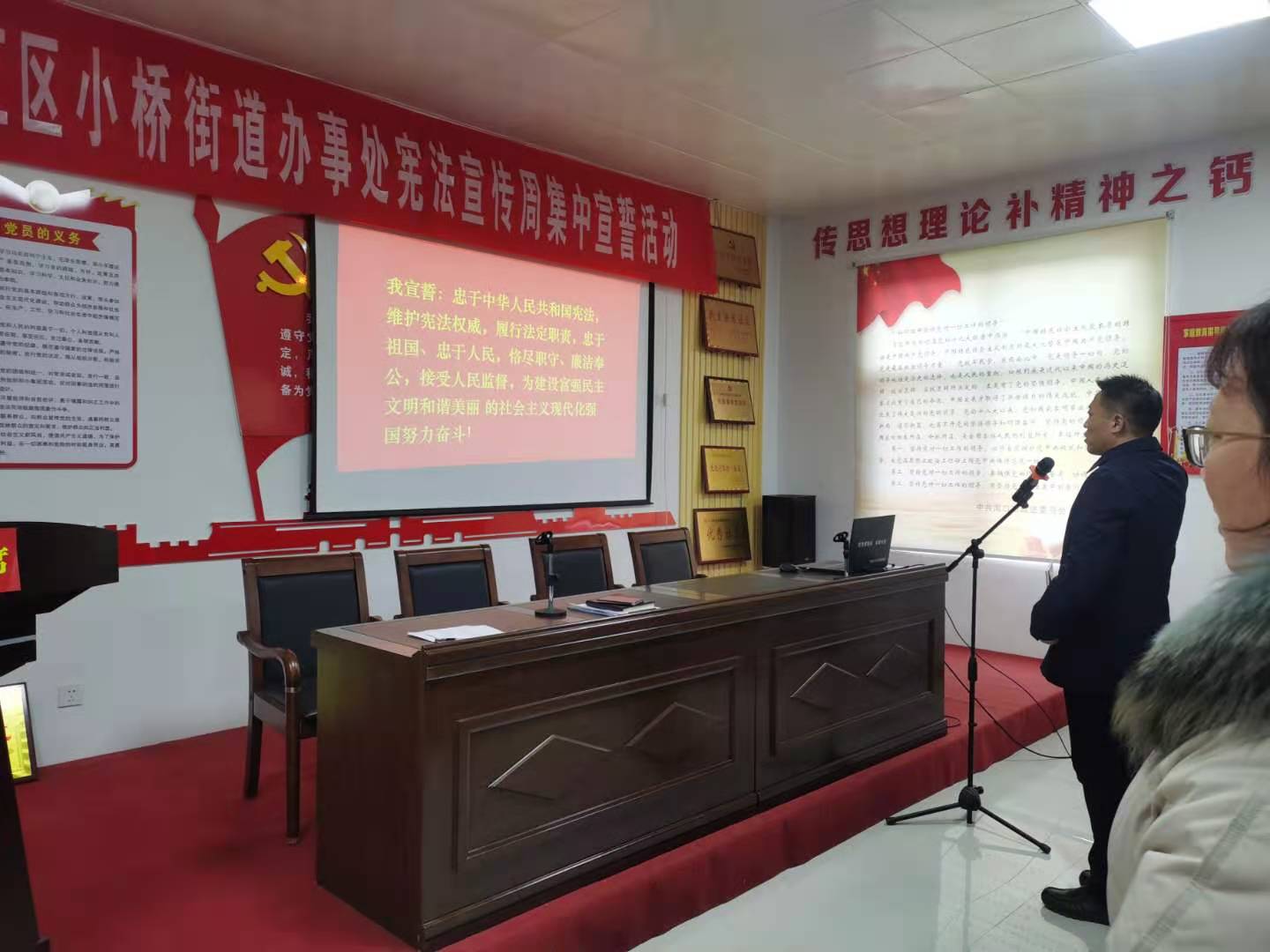 國歌響起,全體人員起立唱國歌。隨后,小橋街道辦事處黨工委書記侯明亮左手撫按憲法,右手舉拳,領(lǐng)誦誓詞,其他宣誓人跟誦誓詞。宣誓后,侯明亮對開展好憲法宣傳周宣傳活動、學(xué)習(xí)黨的十九屆五中全會精神和習(xí)近平總書記關(guān)于憲法的重要論述做了具體安排部署,要求大家要結(jié)合當(dāng)前工作實際,做到依憲施政、依法行政,進一步提高尊法學(xué)法守法用法意識。