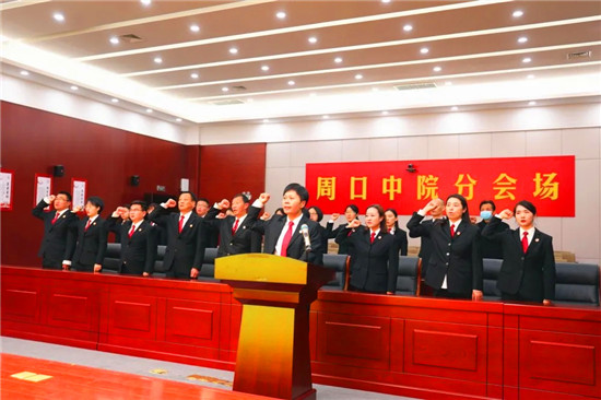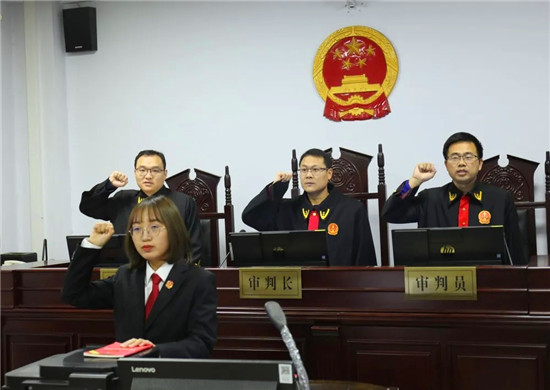 年末歲尾,在各審判庭一線工作忙碌的各辦案團(tuán)隊(duì),同樣右手舉拳,莊嚴(yán)誦讀誓詞。