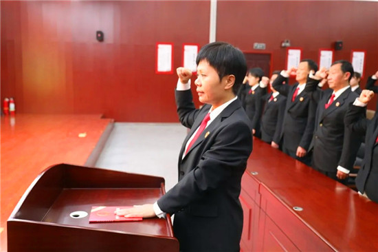 宣誓儀式開始,全體起立,奏唱《中華人民共和國國歌》。隨后,領(lǐng)誓人張冬梅左手撫按《中華人民共和國憲法》,右手舉拳,誦讀誓詞。其他宣誓人列隊(duì)肅立,舉起右拳,莊嚴(yán)跟誦。