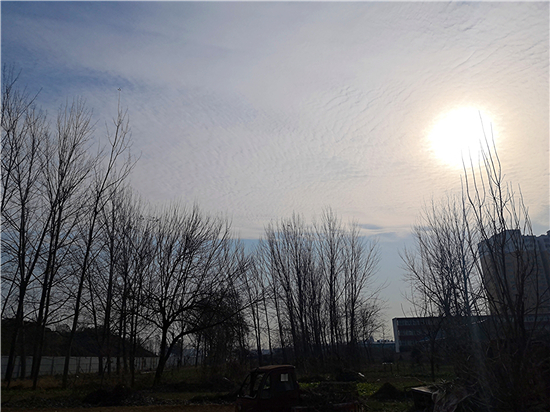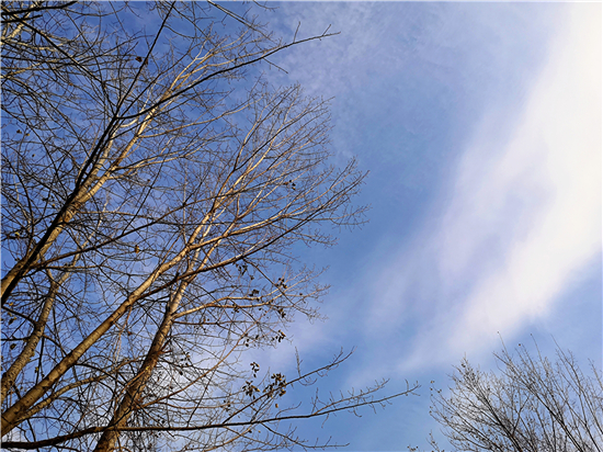 近日,我市天氣晴朗,漫步在街邊小道上,抬頭望去,處處皆是風(fēng)景,比如蔚藍(lán)的天空、挺立的高樓、蒼茫的禿枝……這一切都勾勒成了一幅唯美的冬日畫卷。