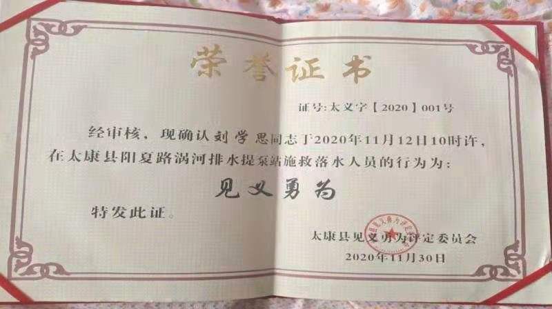 渦河哽咽,落葉飄曳。12月3日上午,太康縣退役軍人劉學(xué)思追悼會莊重舉行。11月12日,根據(jù)工作安排,太康縣對陽夏路渦河排水提泵站進(jìn)行檢查維護(hù)作業(yè)。10時許,一名工人下井作業(yè)意外墜落井下,另外2名工人緊急施救被困,情況萬分危急,被困人員隨時都有生命危險,現(xiàn)場負(fù)責(zé)人及時撥打救援電話。得知此事的市政工程隊職工劉學(xué)思迅速趕到現(xiàn)場,強烈要求下井救人不幸遇難。太康縣見義勇為評定委員會評定劉學(xué)思的救人行為是“見義勇為”。