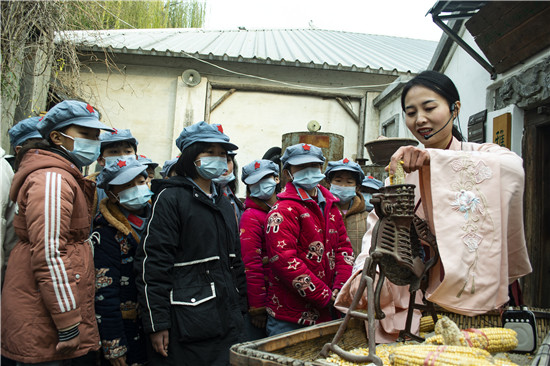 孩子們了解過(guò)去農(nóng)家玉米脫粒場(chǎng)景