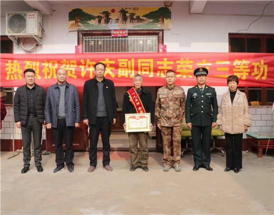 12月28日上午,太康縣符草樓鎮(zhèn)符西行政村鑼鼓喧天、喜氣洋洋??h委常委、副縣長韓維俊,縣人武部政委郭立君,縣退役軍人事務(wù)局局長潘布道,火箭軍某部領(lǐng)導(dǎo)李波,在符草樓鎮(zhèn)黨委書記楊華等陪同下,敲鑼打鼓把三等功喜報(bào)和慰問金送到現(xiàn)役軍人許慶副家人手中。