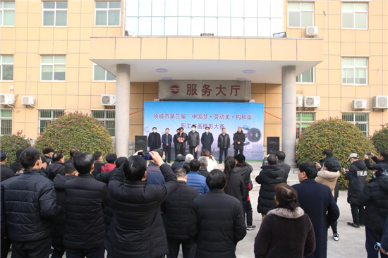 張文成宣布項城市第三屆職工“中國夢·勞動美·構(gòu)和諧”書畫攝影大賽開幕。