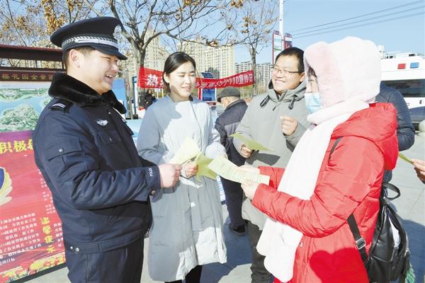 今年1月10日是第35個“110宣傳日”,也是首個“中國人民警察節(jié)”。我市公安系統(tǒng)圍繞“一心為民110,砥礪奮進(jìn)新征程”這一主題,開展了大型宣傳活動。圖為扶溝公安民警向群眾發(fā)放宣傳資料。