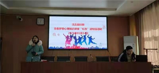 1月14日,沈丘縣婦聯(lián)邀請(qǐng)國(guó)家二級(jí)心理咨詢師張志華、國(guó)家三級(jí)心理咨詢師楊麗麗到沈丘縣第一初級(jí)中學(xué)開展了以“激揚(yáng)青春,放飛夢(mèng)想,我的青春我做主”為主題的心理健康知識(shí)教育講座。