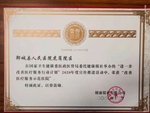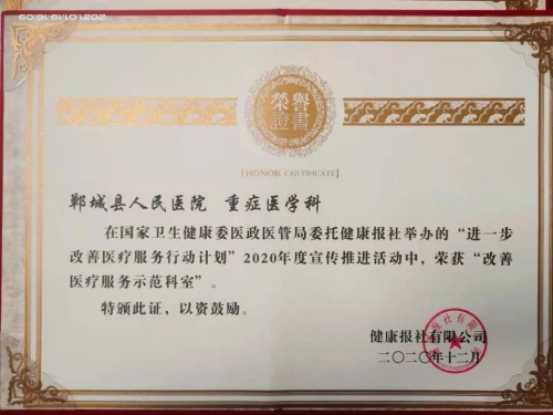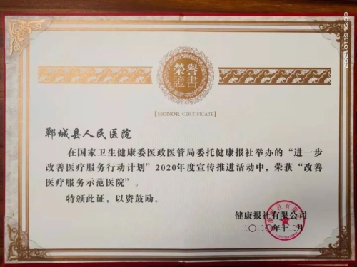 日前,鄲城縣人民醫(yī)院在國(guó)家衛(wèi)健委醫(yī)政醫(yī)管局發(fā)起的“進(jìn)一步改善醫(yī)療服務(wù)行動(dòng)計(jì)劃”活動(dòng)中再獲殊榮,被授予“改善醫(yī)療服務(wù)示范醫(yī)院”榮譽(yù)稱號(hào),醫(yī)院重癥醫(yī)學(xué)科、感染性疾病科榮獲“改善醫(yī)療服務(wù)先進(jìn)科室”,集團(tuán)成員單位虎崗鄉(xiāng)衛(wèi)生院榮獲“改善醫(yī)療服務(wù)示范醫(yī)院”。這也是我院連續(xù)第六年被國(guó)家衛(wèi)健委醫(yī)政醫(yī)管局表彰。