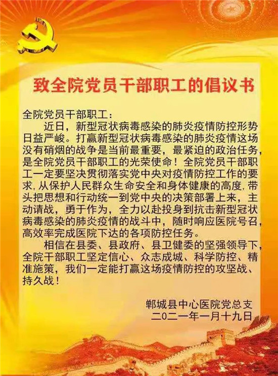 劉輝院長傳達(dá)了市、縣和縣衛(wèi)健委相關(guān)會議精神和領(lǐng)導(dǎo)講話要求,通報了全國抗擊新冠疫情形勢和鄲城縣抗擊疫情情況,肯定了大家前期工作,重申了非常時期的勞動紀(jì)律,要求各級管理人員切實負(fù)起責(zé)任,對照上級通報和檢查中發(fā)現(xiàn)的問題,舉一反三,組織自查自糾,對存在有問題立即整改,開展對全員進(jìn)行培訓(xùn),按抗擊疫情流程要求,加強(qiáng)對就診患者、陪護(hù)家屬和探視群眾嚴(yán)格管理,配合轄區(qū)政府做好疫區(qū)返鄉(xiāng)人員核酸篩查,增加檢查督導(dǎo)力度,嚴(yán)禁診所接診發(fā)熱患者,擴(kuò)大疫情防控宣傳,告誡身邊人不串親不聚會,全體醫(yī)務(wù)工作者凝心聚力,筑牢疫情防控基石,確保全縣人民健康安全,過一個祥和的春節(jié)。