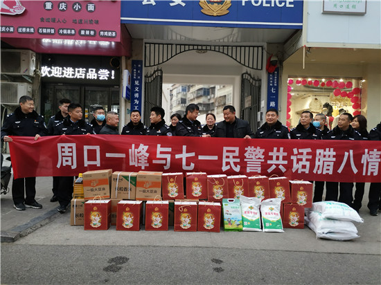 “臘八,臘八,凍掉下巴?!迸D八前后是一年里最為寒冷的時(shí)節(jié)。1月20日臘八節(jié)當(dāng)天,愛心企業(yè)為川匯區(qū)公安分局七一路派出所民警送來慰問品,讓一線基層民警倍感溫暖。該分局副局長周保、治安大隊(duì)長袁剛專程趕到慰問現(xiàn)場(chǎng),代表分局黨委對(duì)愛心企業(yè)的到來表示感謝。