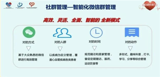 健康關愛群,是一種智能化微信群,利用“互聯(lián)網(wǎng)+技術”,突破空間限制,多渠道分享專業(yè)的疾病管理知識,鼓勵患者每日監(jiān)測體重、血壓、合理健康飲食與運動、規(guī)律按時服藥,以提高患者治療過程中的參與度,養(yǎng)成良好的習慣,全面改善心血管疾病醫(yī)療服務。
