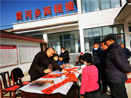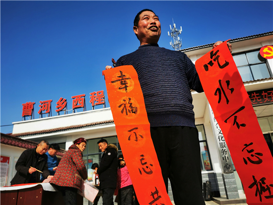 “吃水不忘掘井人,幸福不忘共產(chǎn)黨"。1月30日上午,在淮陽(yáng)區(qū)曹河鄉(xiāng)程樓村,村民孫訓(xùn)濤領(lǐng)到春聯(lián)后邊念邊樂,脫貧后的幸福生活溢于言表。當(dāng)天,淮陽(yáng)區(qū)文聯(lián)組織書法家下鄉(xiāng)義寫春聯(lián),受到群眾熱烈歡迎。