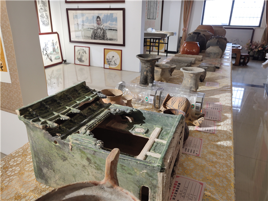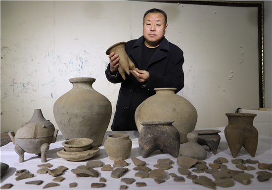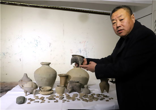 三足燉肉的陶鬲、圓形擦粉的粉盒、前方后圓的灶臺(tái)、帶孔過(guò)濾的茶罐、廣口大肚的糧罐、象形浮雕的方磚、雙耳大肚的水壺……1月31日,鄲城縣文聯(lián)副主席、收藏家協(xié)會(huì)會(huì)長(zhǎng)閆振宇打開(kāi)自己的“博物館”,將多年來(lái)在鄲城縣丁村鄉(xiāng)陶店村出土并收藏的數(shù)十件陶器向記者展示,以此進(jìn)一步證明陶店遺址是龍山文化新時(shí)期石器遺址,疑為中國(guó)灰陶最早生產(chǎn)地,中國(guó)陶器之鄉(xiāng)。
